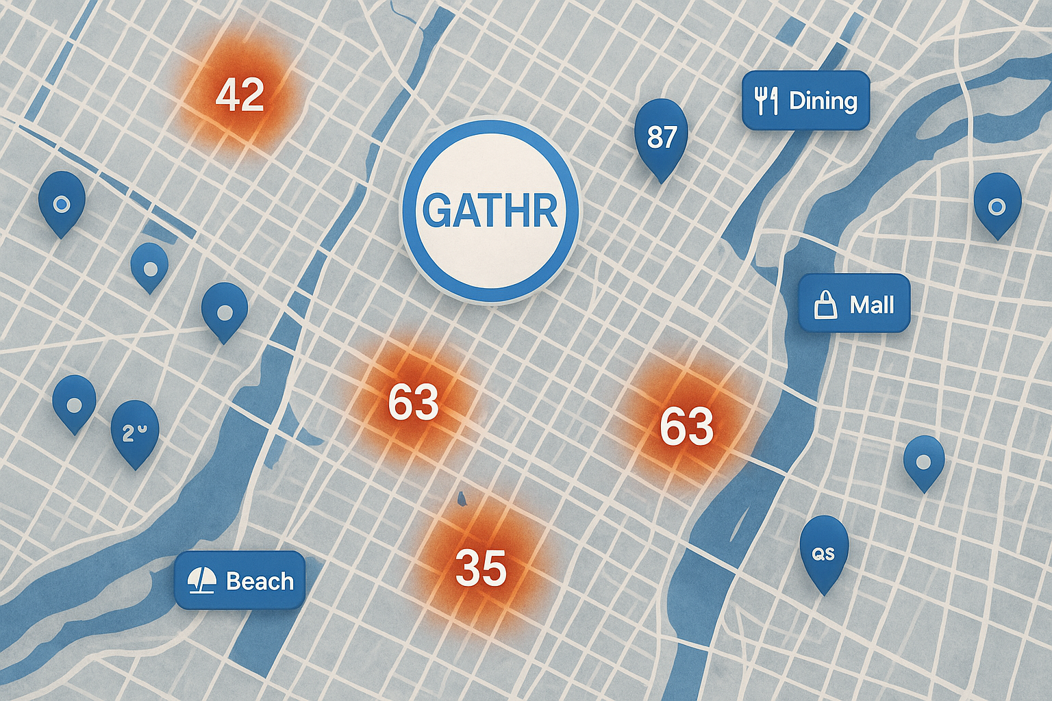 GATHR turns your city into a live, interactive map of real-world activity. Using anonymous, location-based data, it highlights where people are gathering, what’s trending nearby, and where energy is building — all in real time. You can explore hotspots or create your own GATHR for others to join.
